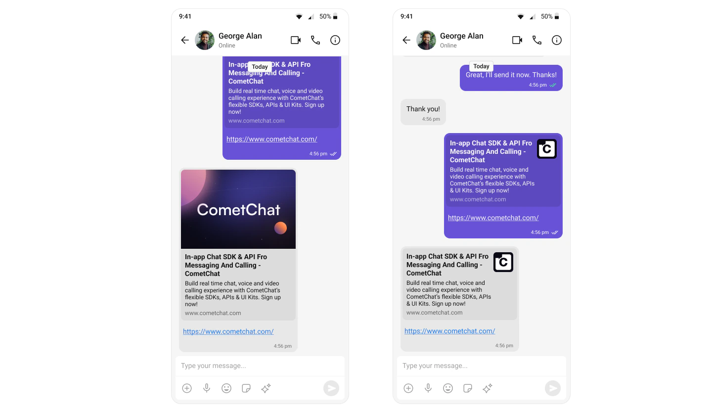 The Link Preview extension provides a summary of the URL shared in the chat. It includes the title, a description, and a thumbnail image from the web page. For a comprehensive understanding and guide on implementing and using the Link Preview Extension, refer to our specific guide on the Link Preview Extension. Once you have successfully activated the Link Preview Extension from your CometChat Dashboard, the feature will automatically be incorporated into the Message Bubble of MessageList Component component of UI Kits.