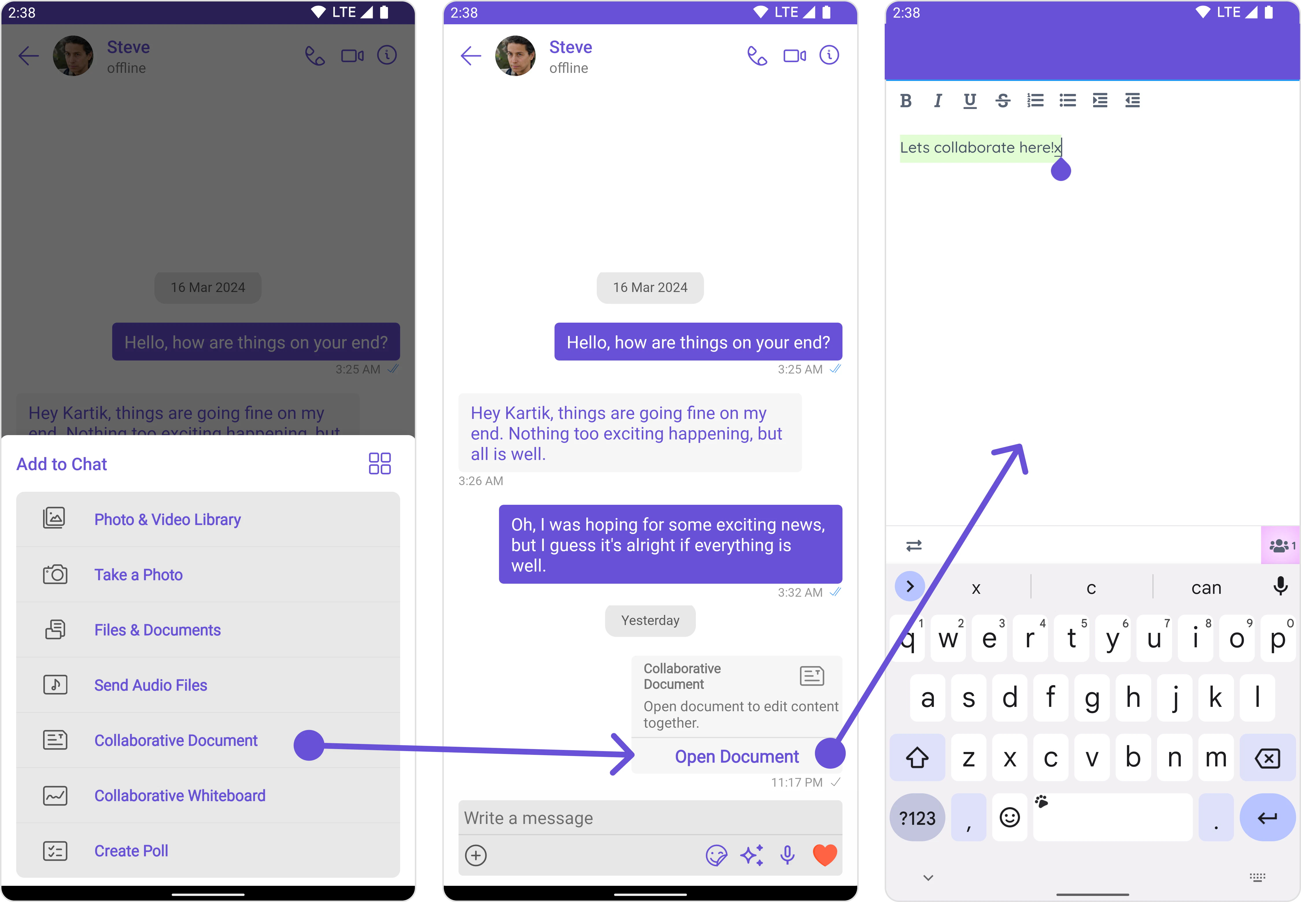 With the Collaborative Document extension, users can work together on a shared document. This feature is essential for remote teams where document collaboration is a recurring requirement. For a comprehensive understanding and guide on implementing and using the Collaborative Document Extension, refer to our specific guide on the Collaborative Document Extension. Once you have successfully activated the Collaborative Document Extension from your CometChat Dashboard, the feature will automatically be incorporated into the Action Sheet of the Message Composer component of UI Kits.