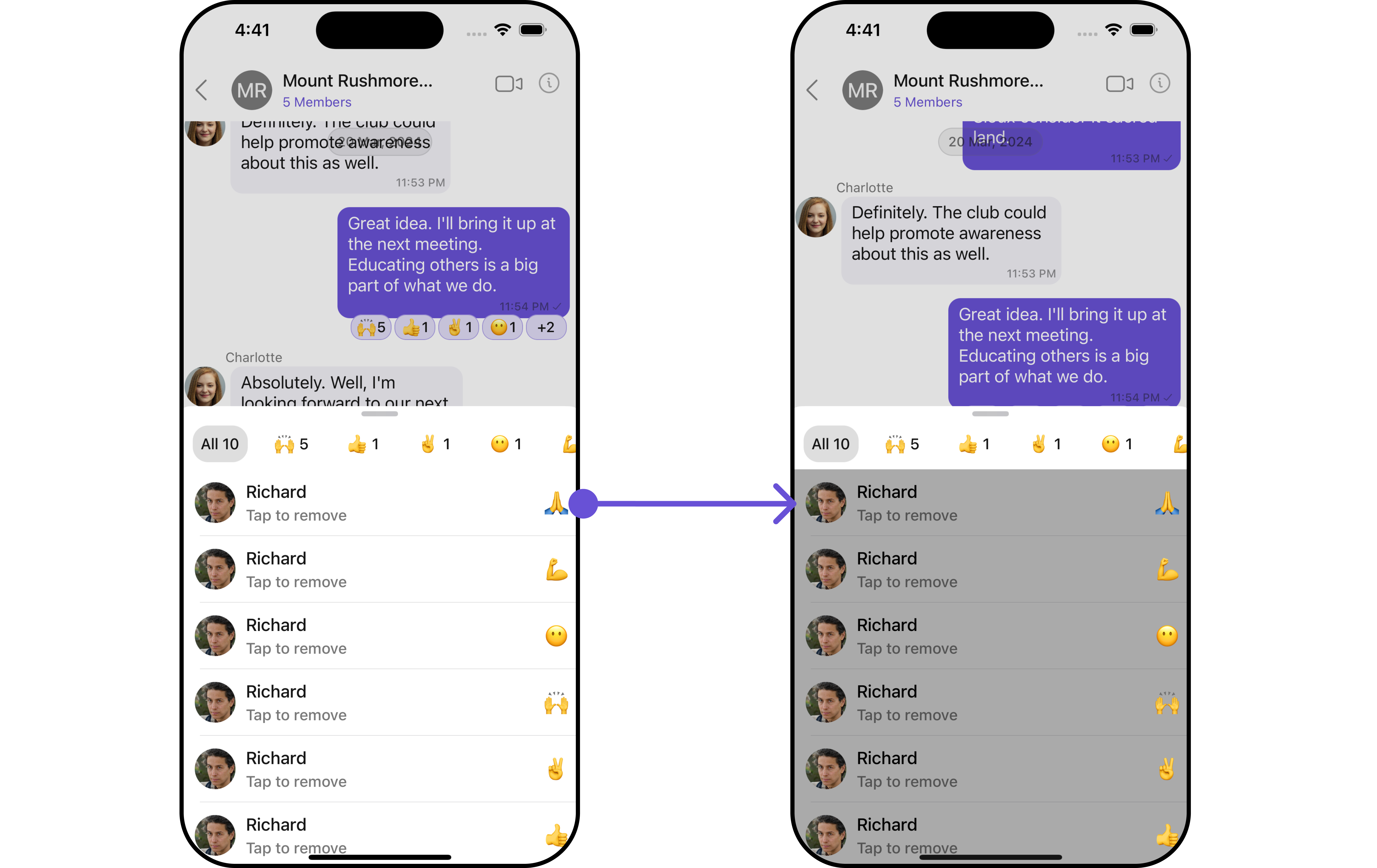 For customization aligned with your app’s design, you can adjust the appearance of the Reaction List component using our accessible methods. These methods enable you to tailor the experience and behavior to suit your specific needs.
